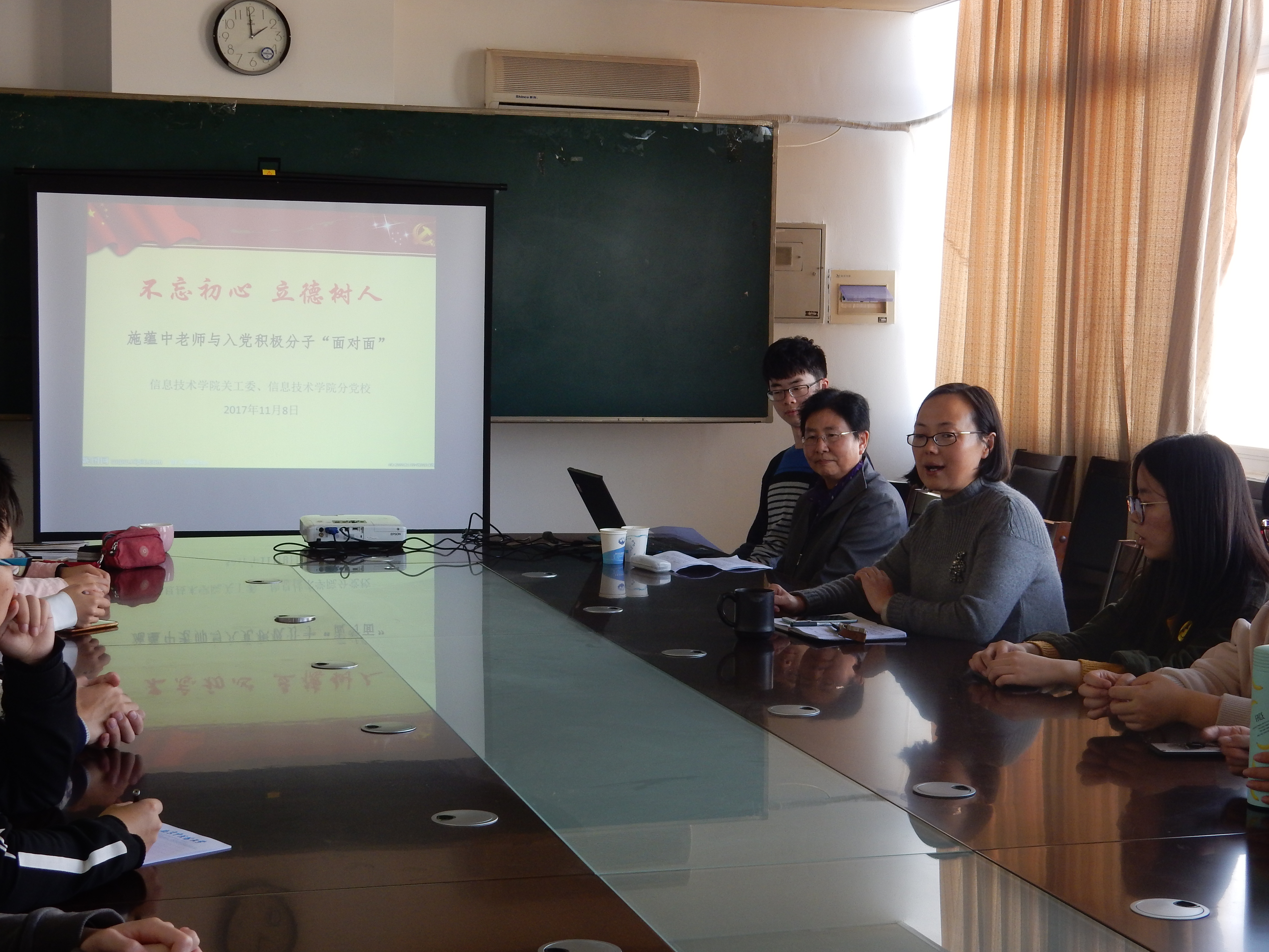118日下午2点,信息技术公司关工委邀请了外国语公司退休教师施蕴中老师,与信息、外国语两院本期分党校学员展开座谈。施老师为此悉心准备多日,多次沟通,精心制作展示课件,认真严谨的态度令参会师生肃然起敬。座谈会由信息技术公司入党积极分子代表胡天乐同学主持,蔡爱华书记出席。蔡书记向同学们简单介绍了施蕴中老师,并强调了本次活动的目的意义。