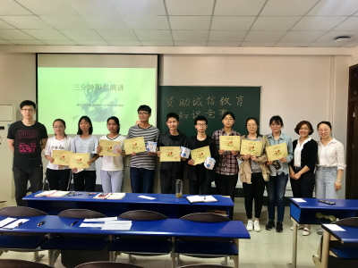 本次知识竞赛共有十组参赛队伍,每队两到三人。竞赛分必答、抢答和围绕“立诚立德,树信树人”即兴演讲附加题三个环节。必答题每队需回答5题,每题10分;抢答共10题,每题20分;附加题自愿选择参加,由评委打分,10到50分不等。在必答环节,各个队伍从容不迫,气氛活跃;到了抢答环节,竞赛气氛更是无比浓厚,主持人“开始抢答”话音一落,各队伍便齐刷刷地举手;最后即兴演讲环节,各队伍代表更是积极发言,表现突出。