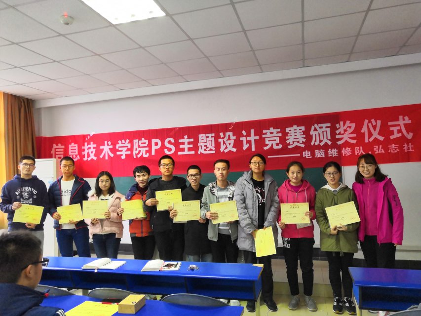 11月20日下午四点半,电脑维修队和弘志社在B4-403教室举办了PS主题设计竞赛颁奖活动。电脑维修队和弘志社部分社员以及社团指导教师沈静老师和刘小平老师参加了此次活动。本次活动由电脑维修队社长助理吴成康主持。