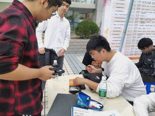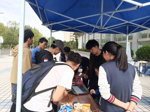 第一时段校园里的同学还不是很多,但是我们的义诊活动吸引不少同学频频驻足。在无人前来的维修时候,社员们便讨论切磋修理技术,为接下的义诊做好准备。