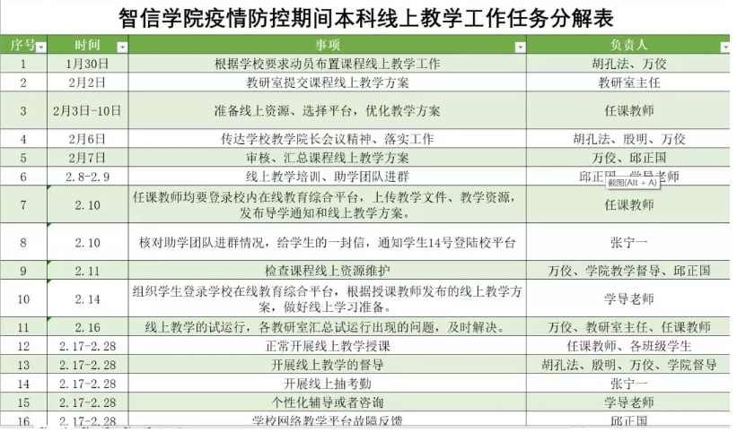 2、分解任务,职责明确。为保证线上教学工作有条不紊的开展,公司面向教师层面,制定了《疫情防控期间本科线上教学工作任务分解表》,明确了线上教学工作的各项任务、时间点和责任人;召开在线教学协调推进视频会议,听取各教研室工作进度汇报,院级层面整合资源,解决矛盾。面向员工,则由学工办牵头,发起了《给PA视讯全体本科生的一封信》,一方面明确了线上开课及开学初常规教学工作的安排,帮助同学们尽快适应“新课堂”,另一方面嘱咐同学们牢记新时代青年的责任与担当,积极做好疫情防护的同时也要明辨是非!鼓励大家彰显南中医智信人的本色,合力打赢这场疫情阻击战!