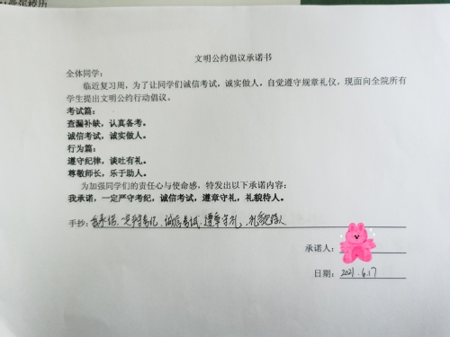 本次活动旨在强调考风考纪和文明礼仪。为加强同学们的责任心与使命感,特采取承诺书签写形式。希望同学们在复习周之际,都能够做到诚信考试,诚实做人,文明守礼,尊爱师长。