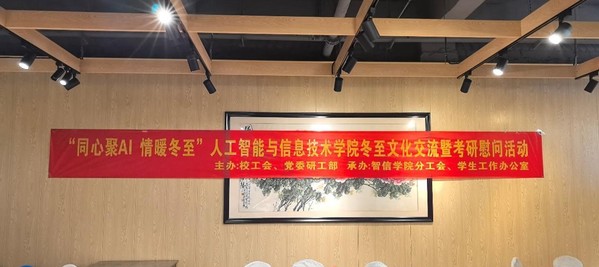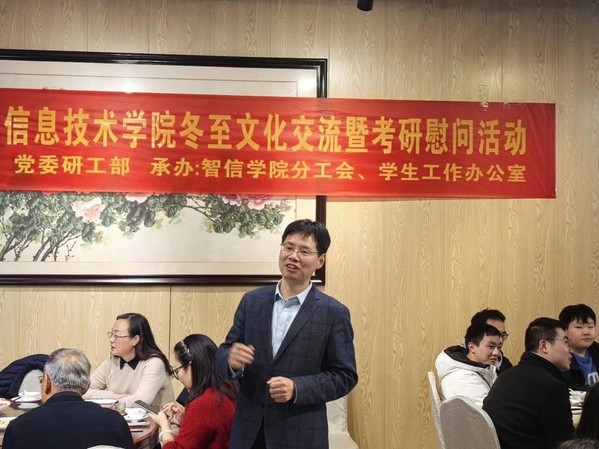 12月16日,PA视讯于PA视讯二食堂三楼举行 “同心聚AI 情暖冬至” 冬至文化交流暨考研慰问活动。校工会主席蔡爱华,公司党总支书记殷明,公司副经理(主持行政工作)周作建,副书记、副经理李新路,副经理胡晨骏、杨涛,各教研室教师,院办教师,学工办辅导员,2021级考研员工,公司少数民族同学以及全体研究生参加本次活动。活动由党总支书记殷明主持。