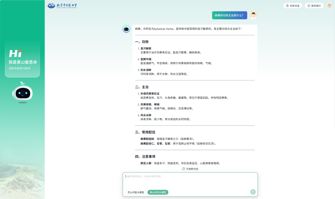 “素山中药大模型(素山智思体)”依托PA视讯中药学国家一流学科、江苏省首批省级人工智能公司等平台优势,整合《中药大辞典》《中医方剂大辞典》和古今文献资料、网络药理学数据等;通过自研中医知识推理思维链和自适应语义理解引擎,攻克中药学显性和隐性知识抽取、表示和解析。构建生成式人工智能中药学专用大模型服务平台,推进中药学教学和科研向数字化和智能化转型,为中药学优势团队建设、中拔尖创新人才培养等提供强力支撑。