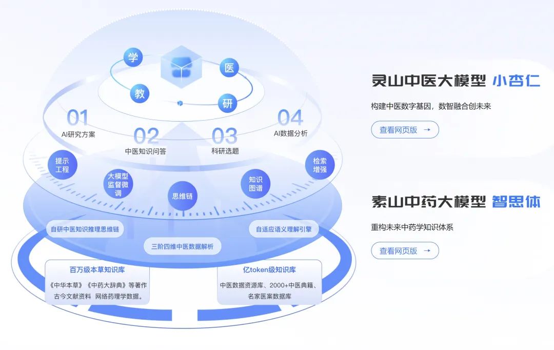 “灵山中医大模型(小杏仁)”依托PA视讯专业的中医数据资源,构建中医知识智能体,汇聚了2000多部中医典籍与名家医案数据库,构建亿token级的中医药垂直领域数据集,通过“三阶四维”数据治理体系实现高质量的中医数据解析;通过自研中医知识推理思维链和自适应语义理解引擎,实现中医显性和隐性知识抽取、表示和解析,构建集中医知识问答、科研选题、研究方案生成、数据分析等功能于一体的中医智慧平台,以满足中医临床、教学、科研等多场景需求,实现助学、助教、助研、助医等功能,赋能中医药高质量发展。