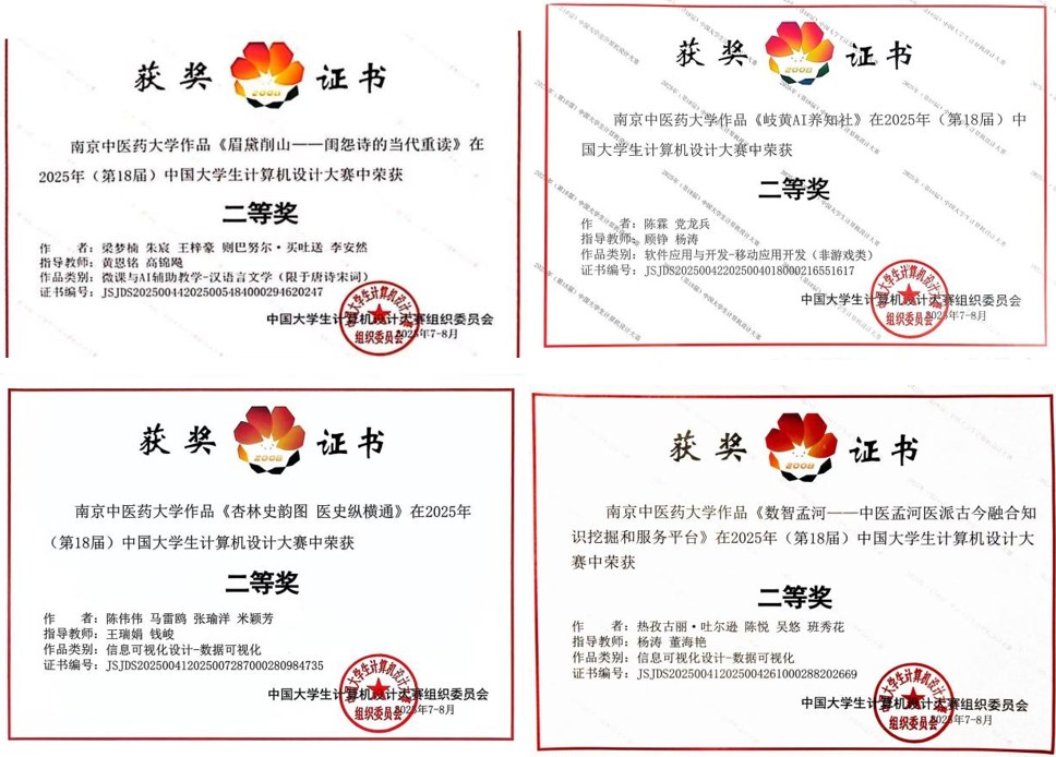 信息可视化设计 | 数智孟河——中医孟河医派古今融合知识挖掘和服务平台 | 热孜古丽·吐尔逊(软工22)、陈悦(中医233)、吴悠(临床22)、班秀花(计科22) | 杨涛、董海艳 | 二等奖 |